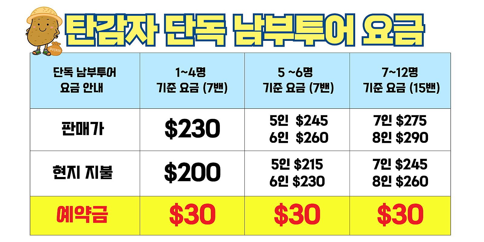 - 기본인원: 1~4인 (*남부투어의 경우 인원 추가에 따른 예약금 추가는 없으며, 현지 지불 금액에서 1인당 $15 씩 추가됩니다.)
