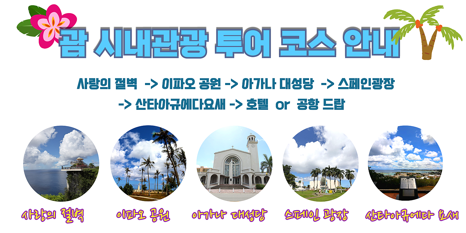 - 투어코스: 아산비치 -> 피쉬아이전망대(*유료/입장선택가능) -> 에메랄드벨리 -> 탈리팍브릿지 -> 세티베이전망대 -> 스페인마을 -> 솔레다드 요새 -> 메리조부두 -> 이나라한자연풀장 -> 호텔 or 공항 드랍