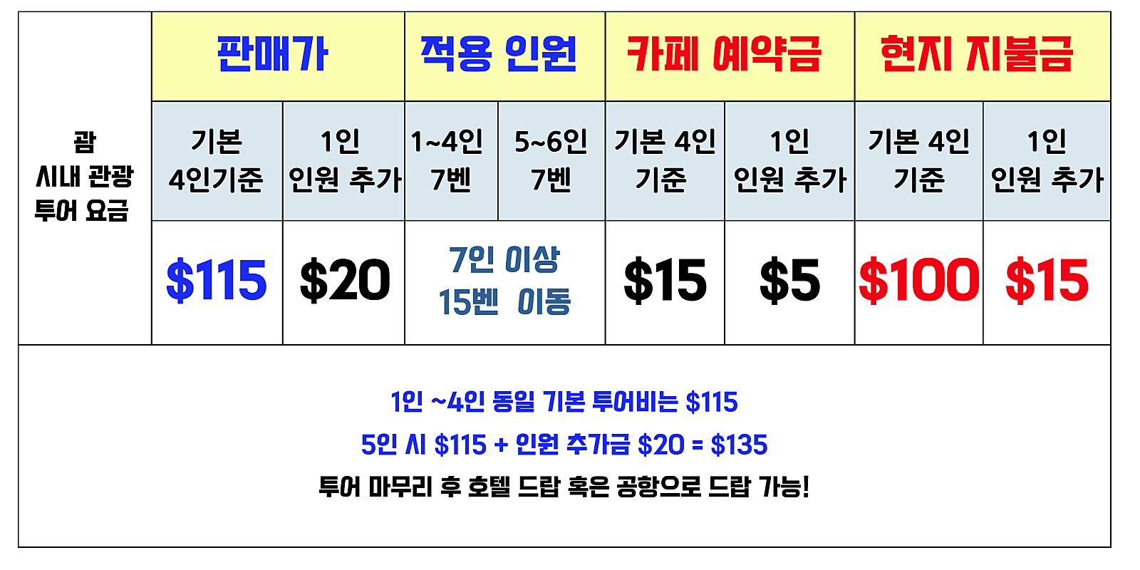 - 기본인원: 1~4인 (*5인 이상 투어 진행 시 추가 인원 1인당 예약금 $5 + 현지지불 $15 = 총 $20 추가됩니다.)